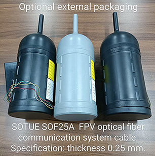 Application: SD8338G excellent FPV drone is a kind of reconnaissance, surveillance and combat drone, normally widely used to reconnoitre and monitor enemies, enemy's buildings and dangerous objects and also used to forest fire prevention and border patrol. Optional use: 13-inch or 15-inch or 18-inch or 20-inch or 25-inch or 30-inch FPV drone which is flying with SOTUE SOF25A optical fiber communication cables will not be jammed by any equipment and will be controlled safely and very reliable. SOF25A optical fiber communication cables are as shown below.